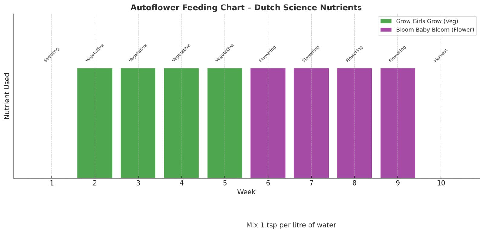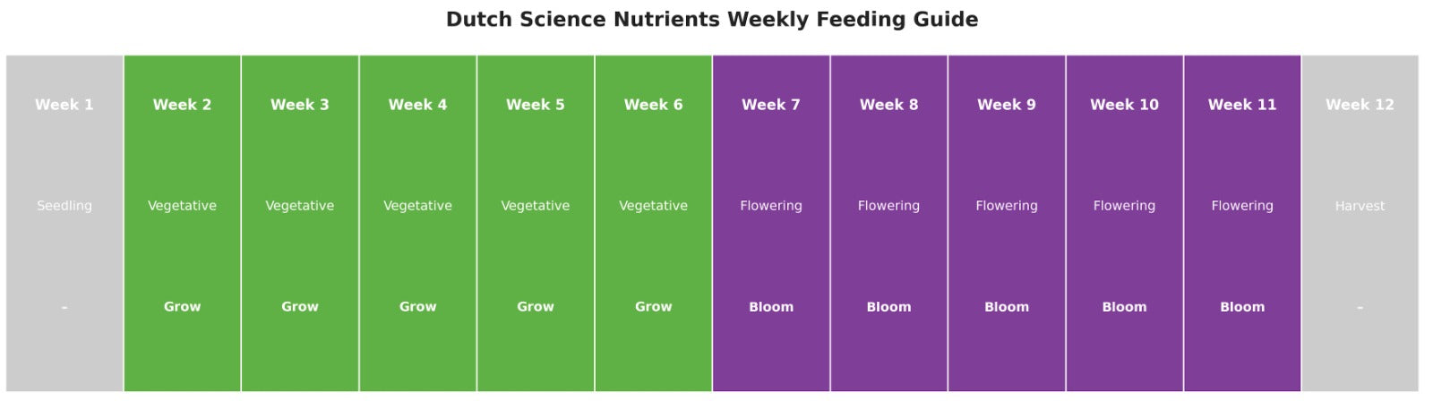 We make it easy — take a look at our feeding chart below, broken down by products, water amounts, and plant cycles. You'll be growing big, tasty flower in no time at all!